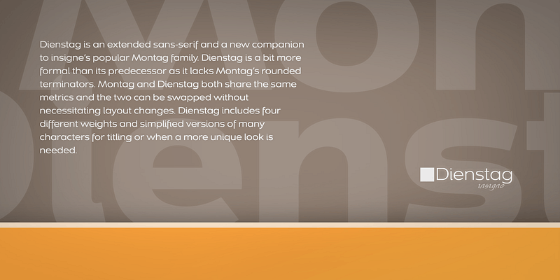 Dienstag is an extended sans-serif and a new companion to Insigne’s popular Montag family.