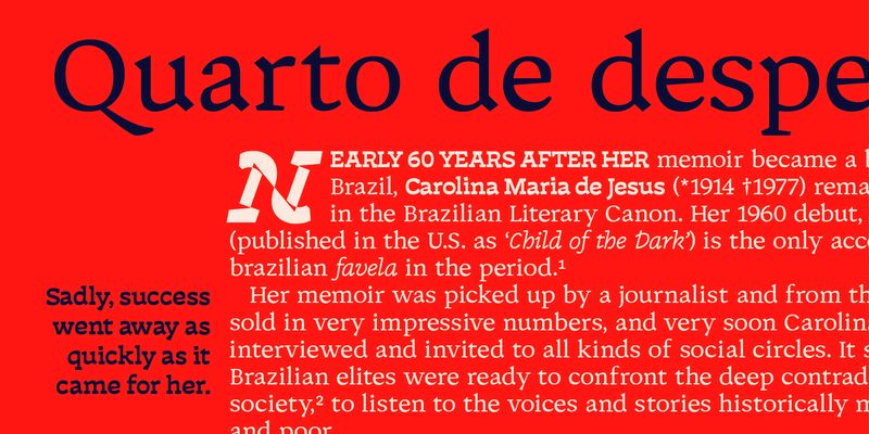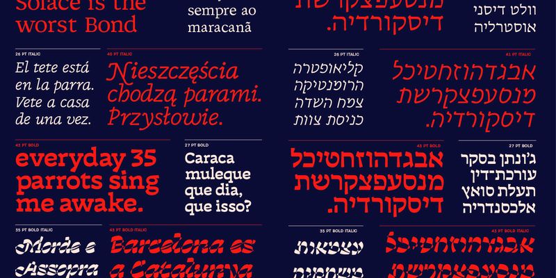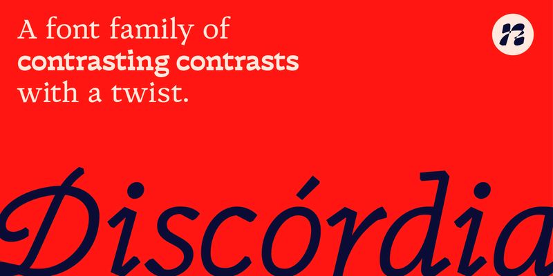 Discórdia is a type-family of contrasting contrasts. Each of the four members of the family has a different contrast type. Regular has broad-nib contrast, Bold has horizontal contrast, the Italic is monoline, which means it has no apparent contrast, and Bold Italic is… Well, it’s probably best if see for yourself.