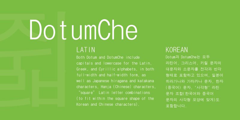 Dotum (돋움체) is a Korean sans serif produced by HanYang I&C Co., Ltd. DotumChe is the condensed variant.