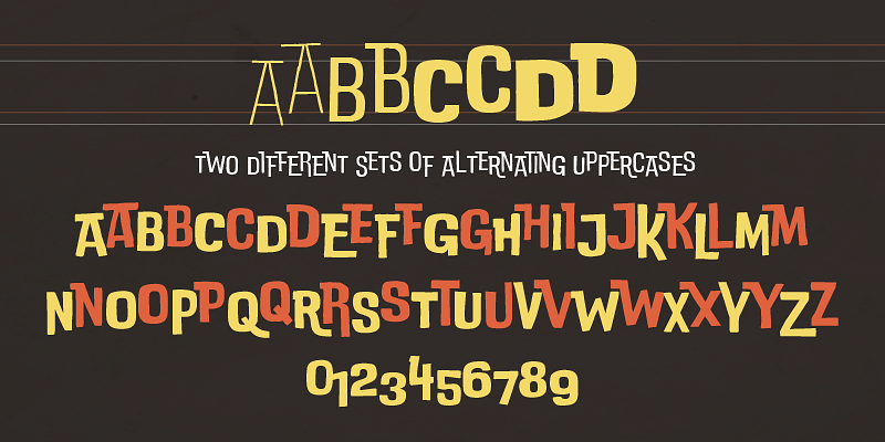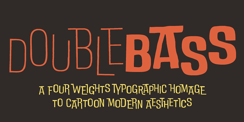 The result is DoubleBass, a jazzy four-weights display family that provides an out-of-the-box tool for cartoon modern style logo and heading design. The alternating sets of capital letters and numbers make sure that a bouncy rhythm is kept while you type away, thanks to open type ligature substitution.