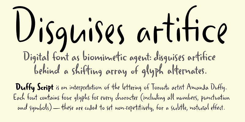 An interpretation of the lettering of contemporary Toronto illustrator Amanda Duffy. Each weight contains four glyphs for every character (including all numbers, punctuation and symbols). These are coded to set in a non-repetitive order, for a subtle, pleasantly natural effect—and this is generally what is meant by “pseudo-random” in OpenType fonts. The variant glyphs for each character are not radically different, but consistent in the way that letters from Duffy’s hand exhibit slight modulations from a distinctive pattern. While casual script fonts without a pseudo-random feature may be used to signify certain values, fonts with it go a step further in analogue simulation, reproducing the experience of reading hand lettering.