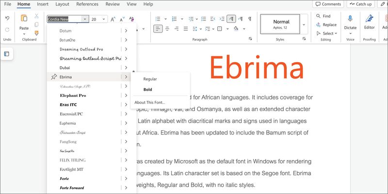Ebrima is a typeface designed for African languages. It includes coverage for Nko, Ethiopic, Tifinagh, Vai, and Osmanya, as well as an extended character set in the Latin alphabet with diacritical marks and signs used in languages throughout Africa. Ebrima has been updated to include the Bamum script of Cameroon. Ebrima was created by Microsoft as the default font in Windows for rendering African languages. Its Latin character set is based on the Segoe font. Ebrima has two weights, Regular and Bold, with no italic styles.