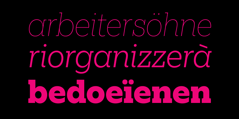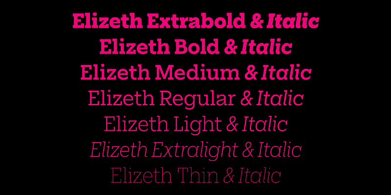 Elizeth is the seriffed counterpart to Ofelia. It is a very versatile typeface in two widths and seven weights, to be used in a great variety of situations. The normal width is a geometric slab which evokes early XX century rationalism — establishing dialogue with typefaces such as Rockwell — however using bracketed serifs. The typeface offers true italics, broad language support and a sort of OpenType features such as Small Capitals, old style and tabular figures.
