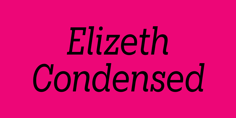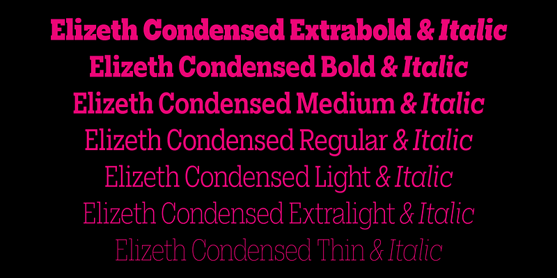 Elizeth is the seriffed counterpart to Ofelia. It is a very versatile typeface in two widths and seven weights, to be used in a great variety of situations. The normal width is a geometric slab which evokes early XX century rationalism — establishing dialogue with typefaces such as Rockwell — however using bracketed serifs. The typeface offers true italics, broad language support and a sort of OpenType features such as Small Capitals, old style and tabular figures.