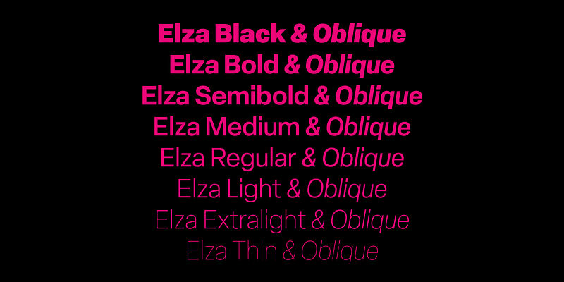 Elza is a typeface who responds to the intention of creating a type family without any personal traits or distinguishable features. The font offers oblique versions instead of true italics, and its widths are significantly more condensed than the respective Roman versions, so they stand out better when used together. It is the largest family in Blackletra’s library to date, with 8 weights, 3 widths and 2 optical sizes for a total of 58 fonts. Each font has approximately 900 glyphs and offers broad language support and OpenType features like small caps, tabular and old style figures, and an alternate character to lowercase /a (one-storey). It is Blackletra’s first typeface to offer a variable version with weight, width and slant axes.