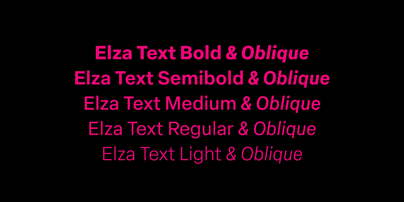 Elza is a typeface who responds to the intention of creating a type family without any personal traits or distinguishable features. The font offers oblique versions instead of true italics, and its widths are significantly more condensed than the respective Roman versions, so they stand out better when used together. It is the largest family in Blackletra’s library to date, with 8 weights, 3 widths and 2 optical sizes for a total of 58 fonts. Each font has approximately 900 glyphs and offers broad language support and OpenType features like small caps, tabular and old style figures, and an alternate character to lowercase /a (one-storey). It is Blackletra’s first typeface to offer a variable version with weight, width and slant axes.