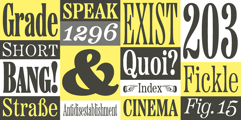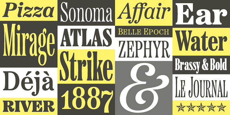 Etna (2020) was inspired by the Aetna wood type style of the late nineteenth century. Etna tames this quirky Victorian design into a complete family suitable for modern use, adding a full range of six weights and italics, allowing it to work equally well for both text and display. Etna includes three different condensed widths in all six weights (intended for display use), four different figure styles, alternate characters, true small caps, and a selection of dingbats, including arrows, stars, asterisks, and manicules (pointing hands).