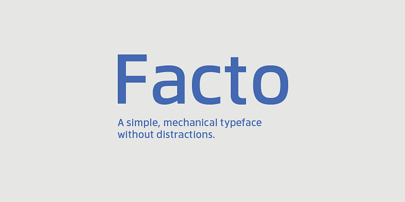 Facto is a no-nonsense mechanical sans-serif with 12 weights including italics, 480 characters, five variations of numerals, stylistic alternatives, manually edited kerning and OpenType features.