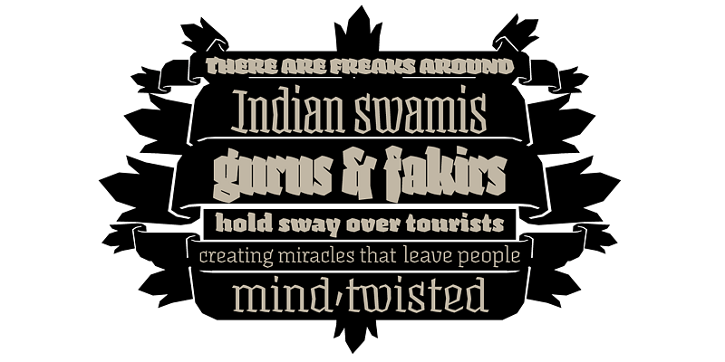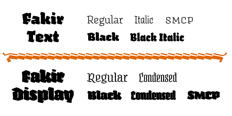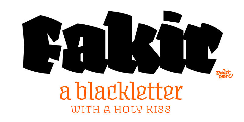 Fakir is a contemporary blackletter, with a unique aspect. Next to its 5 display fonts, it comes in 5 text fonts too for long pieces of text, suitable for contemporary readers.