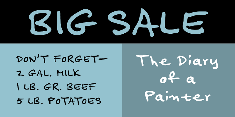 Felt Tip Senior (2000) is a facsimile of my dad’s handwriting, which of course had a big influence on my own handwriting (see my font Felt Tip Roman). He almost always writes in caps, so the lowercase has some surprising and idiosyncratic forms. I originally created this font as a gift to my dad in 1995. His name is Leroy so I called it “Leroy Lettering.” But since that’s a brand name of a lettering tool that some people still use, it could be confusing. I released it as Felt Tip Senior, with my dad’s permission.