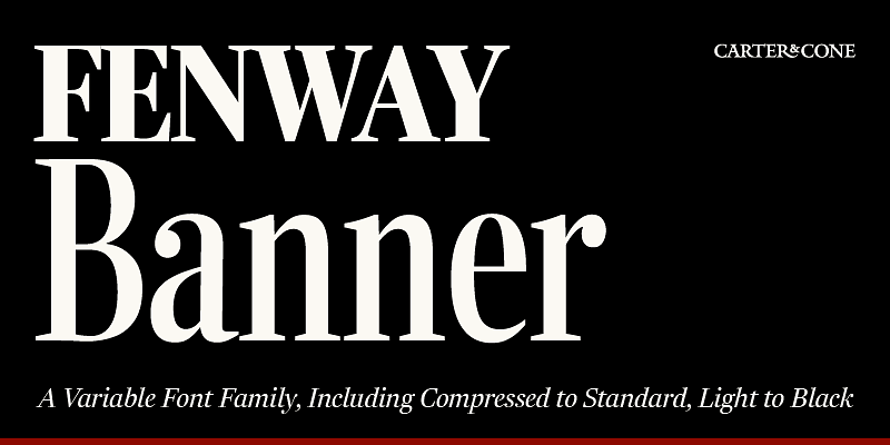 Designed by Matthew Carter. Richard Lipton and Jill Pichotta of The Type Founders contributed in the expansion. Fenway Banner is a font family from Carter & Cone—a member of The Type Founders collection. For additional license options like app, enterprise, multi-user, and self-hosted web, visit Carter & Cone.”