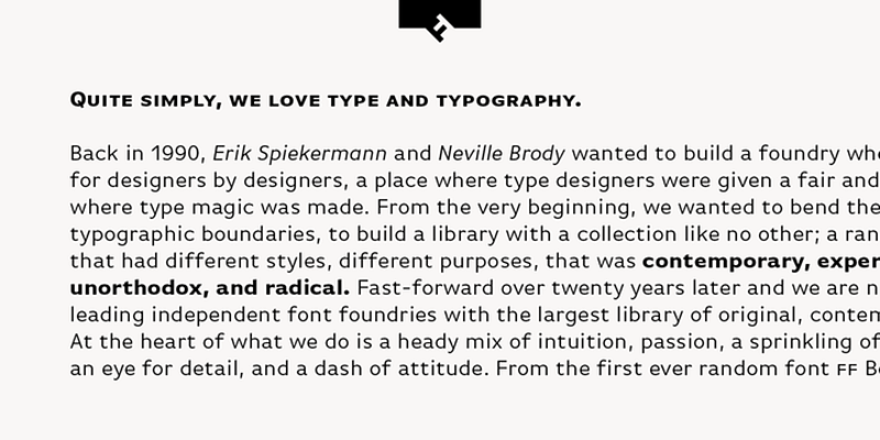 The FontFont Library is the world’s largest collection of original, contemporary typefaces. What makes the FontFont Library unique is its wide variety of outstanding type designs. The spectrum of styles ranges from tasteful, high-quality text faces to distinctive display fonts that reflect current moods and often set new typographic trends.
