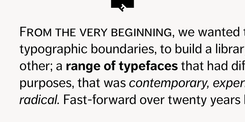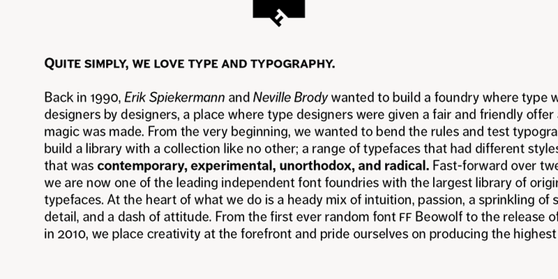 The FontFont Library is the world’s largest collection of original, contemporary typefaces. What makes the FontFont Library unique is its wide variety of outstanding type designs. The spectrum of styles ranges from tasteful, high-quality text faces to distinctive display fonts that reflect current moods and often set new typographic trends.