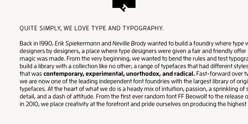 The FontFont Library is the world’s largest collection of original, contemporary typefaces. What makes the FontFont Library unique is its wide variety of outstanding type designs. The spectrum of styles ranges from tasteful, high-quality text faces to distinctive display fonts that reflect current moods and often set new typographic trends.