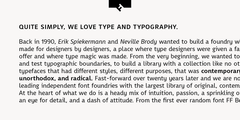 The FontFont Library is the world’s largest collection of original, contemporary typefaces. What makes the FontFont Library unique is its wide variety of outstanding type designs. The spectrum of styles ranges from tasteful, high-quality text faces to distinctive display fonts that reflect current moods and often set new typographic trends.