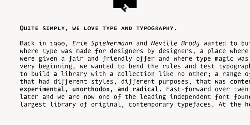 The FontFont Library is the world’s largest collection of original, contemporary typefaces. What makes the FontFont Library unique is its wide variety of outstanding type designs. The spectrum of styles ranges from tasteful, high-quality text faces to distinctive display fonts that reflect current moods and often set new typographic trends.
