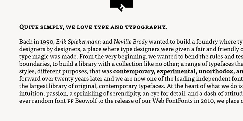 The FontFont Library is the world’s largest collection of original, contemporary typefaces. What makes the FontFont Library unique is its wide variety of outstanding type designs. The spectrum of styles ranges from tasteful, high-quality text faces to distinctive display fonts that reflect current moods and often set new typographic trends.