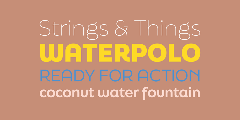 FinalSix is the typographic adaptation of custom lettering for the 2014 European Water Polo Final. While working on the graphics for that event José Manuel Urós had the idea to create a character set that reflected the idea of the undulating movement of water in a pool. With the word “WATERPOLO” as a visual reference, the FinalSix’s characters have rounded tops, bottoms, and diagonals, creating a wavy feeling. Urós defines the process as “form follows meaning.” To preserve its personality as much as possible, the most idiosyncratic characters are found in the Default set, while the more standard variations for editorial use can be found in a Stylistic set.
