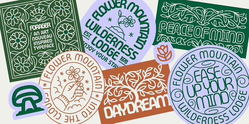 Forager is the culmination of a deep love for display fonts, nature, and psychedelic rock. It combines the design aesthetics of the 70s, the flow of Art Nouveau, and the simplicity of sans serifs into an overlapping typeface. The typeface has a combination of bowed verticals and flat horizontals that give Forager its rounded square shape which helps to improve legibility when overlapped. The family consists of five weights in both overlap, and tightly spaced styles