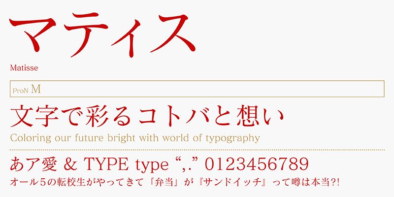 FOT-Matisse ProN is a Mincho-style typeface designed from basic principles of type design, but with a sharpness and elegance produced by its smooth and soft curves. Any texts set in this typeface will have maximum readability. This family has six weights with a remarkably thin weight “L” compared with similar fonts from other type foundries.