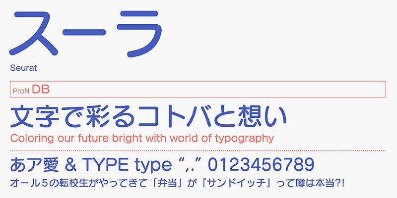 FOT-Seurat ProN is a popular typeface typical of Desktop Publishing in Japan. It is a “modern” round gothic (sans-serif) typeface with large counter spaces. As each character is designed to be larger than usual, the design has warm and gentle look with the aesthetic quality of typeset results given high priority. The typeface family has six weights, and is suitable for a wide range of usage from body text to display. This typeface has been used for publications targeting a wide range of age groups.