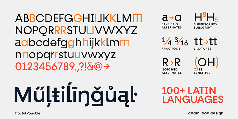 Fractul Variable is an architectural geometric sans serif. Dramatically modern because of a larger x-height with a more distinct and avant-garde voice—most evident in characters where specific strokes have been straightened for a strongly angular appearance. This family is feature-rich with all of the typographic niceties designers have come to expect. Here’s a tip: because Konnect is where Fractul began, it works perfectly as a more subdued partner!