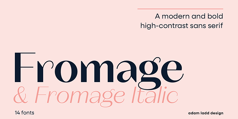 “Fromage—now with italics—is a modern, high-contrast sans serif font families balancing the unexpected with restraint. With a generous x-height and round forms, Fromage has angled and elongated terminals making it more stately and dramatic. The font family offers flexibility and legibility for diverse applications, and an elegant air with a dynamic rhythm makes Fromage an obvious choice for fashion, beauty, and luxury branding.