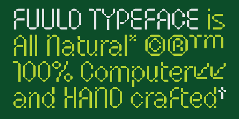Fuuld is a bold modern display font that mixes organic and geometric, hand made, and digital production. It has a contemporary look perfect for logos, posters, branding, magazines, and more. The cool thing about this font besides how cool it looks is that it uses less ink than a regular font in its weight. This makes it perfect for any environmentally conscious print projects. Try the font with no fill and a stroke for a whole new style