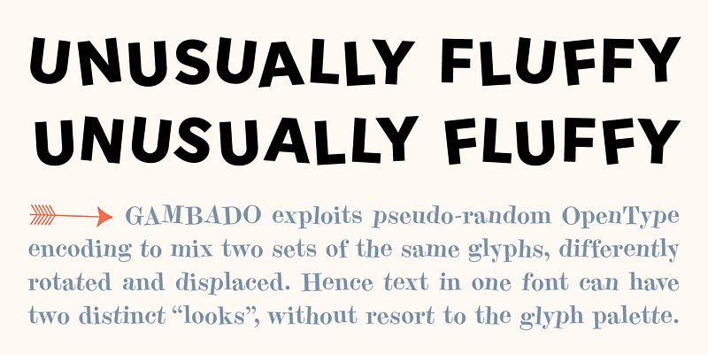‘Bounced’ is the technical term for a higgledy-piggledy style of lettering in which characters are shaken up by a combination of rotation and vertical displacement from the presumed norm of upright stance on a baseline. Now, by utilizing pseudo-random contextuality in the OpenType format, Gambado creates complex, default bouncing automatically through the agency of a font, rather than letter-by-letter manu-al adjustments at the level of layout.