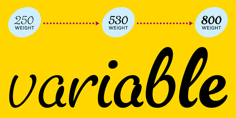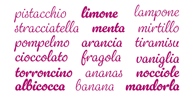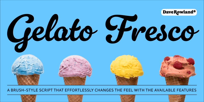 Gelato Fresco Variable is a brush-style script family that started life in 2011 as the popular Gelato Script. What was always typographically refined has reached new levels of versatility with an expanded weight range. This design has graced everything from designer handbags to prime-time TV shows, food blogs, wedding invitations, glossy magazines, and ice cream shops. You can effortlessly change the feel with the many features available, and it will work like a charm right out of the box.