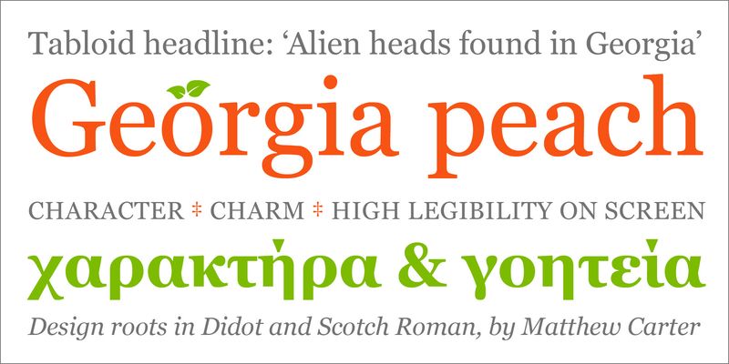 Type designer Matthew Carter created Georgia in 1996 to make reading on low-resolution screens easy and acceptable. It is related to his text typeface Miller, which is very popular in print publications, and which shares the same roots in the 19th-century text typefaces known as Scotch Roman. Georgia manages to accommodate a host of limitations presented by 1990s screen technology, yet the designer’s skill is such that you’d never notice any compromises in the design. Georgia has become one of the most common typefaces used on the web.