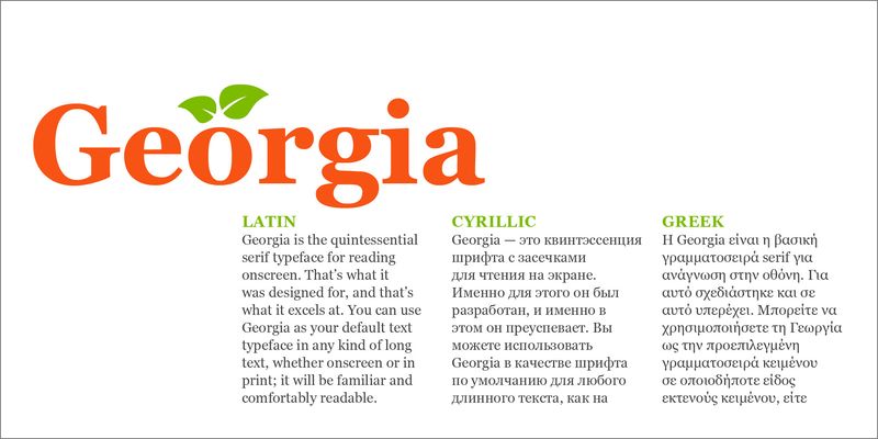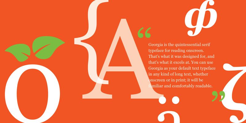 Georgia is the quintessential serif typeface for reading onscreen. That’s what it was designed for, and that’s what it excels at. You can use Georgia as your default text typeface in any kind of long text, whether onscreen or in print; it will be familiar and comfortably readable. The font’s default numerals are “old-style” (like lowercase letters), which look good in text but might be surprising in a spreadsheet.