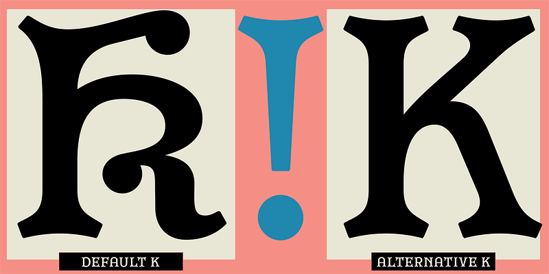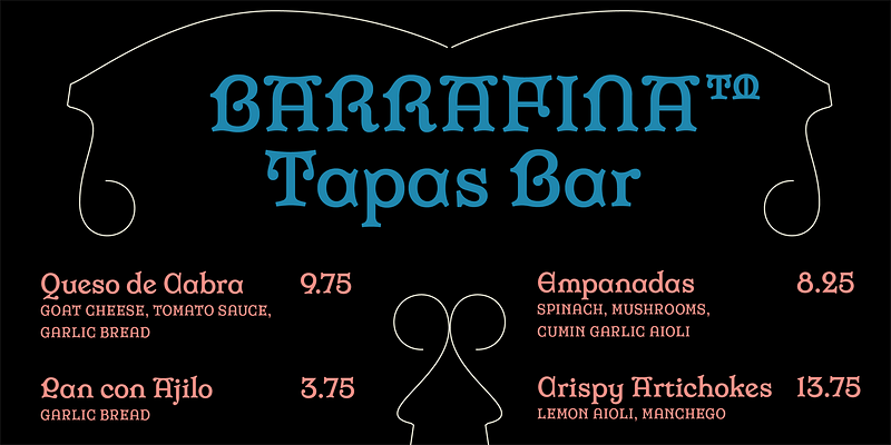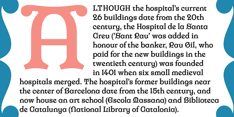 Gil Modern is a distinctive low-contrast display typeface featuring Lombardic capitals and rounded lowercase letters also suitable for small-size typesetting. Inspiration came from a medieval parody developed within the context of the Catalan Art Nouveau movement