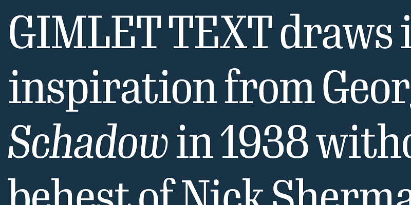 Gimlet draws its inspiration from Georg Trump’s 1938 typeface, Schadow. At the behest of Nick Sherman, David Jonathan Ross reimagined the oddball serif as an energetic contemporary workhorse, complete with three optical sizes and a flexible set of widths tailored for responsive layouts. A multifaceted series that speaks with a singular voice, Gimlet is a rare find: a typeface that is as funky as it is functional.
