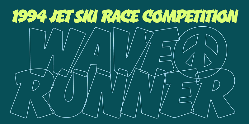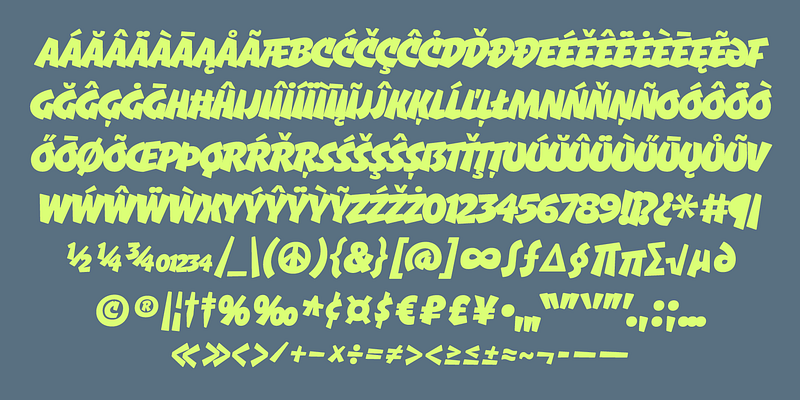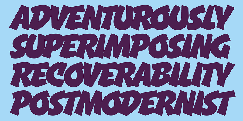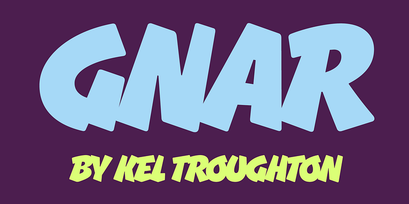 Gnar is a bold and bottom-heavy display typeface. Its forms are influenced by the casual capitals of American sign painters, but Gnar gets its feeling from 1990s loud sports graphics. It experiments with intentional overlapping letters to maximize impact, even featuring some alternate letter shapes when needed. Try this heavy headliner for your next action/adventure movie poster, or monster truck graphic.
