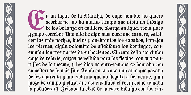 Mexican type designer José Manuel López Rocha, in his exploration of old books, found and fell in love with this Schulfraktur, a traditional blackletter that was commonly used to compose school books in 19th century Germany. In his interpretation, on the one hand faithful to the original style and on the other hand executed with impeccable drawing, this Schulfraktur (baptized “Gorgias” after the title of the book where he first found it) added new glyphs, irresistible ornaments and even a complete set of initials of the time, all of which contribute to a proper staging of this very bookish German type style. Gorgias includes 4 versions, Regular and Black in solid and open forms. This unique typeface is intended for designers of conviction who like to captivate their readers by combining classic and contemporary elements in a special way.