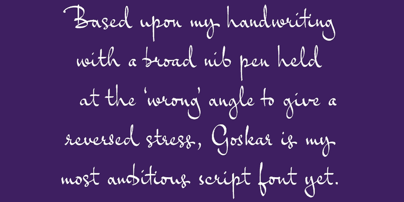 Goskar is our most ambitious script font yet, taking shape when a broad nib fountain pen was held at the ‘wrong’ angle, resulting in handwriting with a reversed stress appearance. Goskar is named after an imposing rock on Tenby’s north shore in Wales. It’s an ultra-realistic single axis (weight) Variable Font brimming with character.