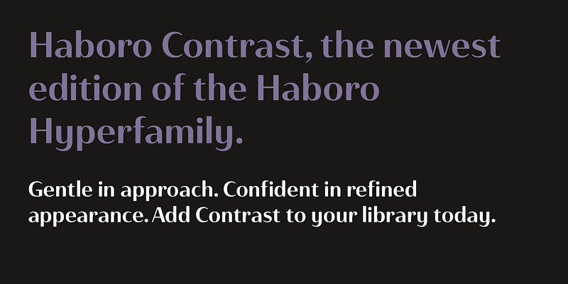 Meet Haboro Contrast, the stylish little sister of the Haboro hyperfamily. While built from the same clean, geometric shapes of Haboro Sans, this new addition has been rebalanced for elegant performance.