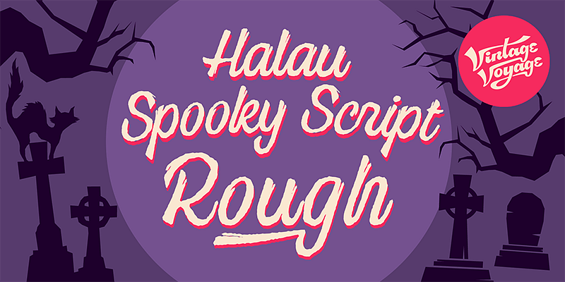 Vintage Voyage Design’s Halau Spooky Script is a creepily enchanting typeface for Halloween or other ghoulishly delightful events. It is meant for headlines, but because of its open shapes, it also works well at smaller subhead sizes! The various alternates within stylistic sets will completely satisfy the most sophisticated font gourmet, too. Choose Halau Spooky Script for party invitations, food packaging, theater posters, and anywhere else you might want something a little devilishly dark.