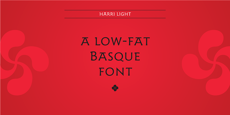 Harri (which means “stone” in Basque) is a display font based on the hallmark letterforms used in signs and building façades all over the Basque Country in Spain. This idiosyncratic lettering style, unique to the culture, evolved from ancient inscriptions carved on gravestones that can still be found in the French part of the Basque Country (Behe Nafarroa, Lapurdi, and Zuberoa). Harri takes some of its more significant features from those engraved letterforms, but also from the current overemphasized shapes derived from them, while remaining mindful of their ancestors: Roman inscriptions and—going even further back—Roman capitals. This evolution is echoed in Harri throughout its weights, from the clean formal Light to the expressive ExtraBold; Type-Ø-Tones 2017