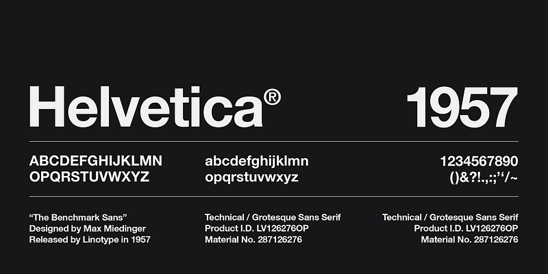 With the name Helvetica (Latin for Swiss), this font has the objective and functional style which was associated with Swiss typography in the 1950s and 1960s. It is perfect for international correspondence: no ornament, no emotion, just clear presentation of information. Helvetica is still one of the best selling sans-serif fonts.