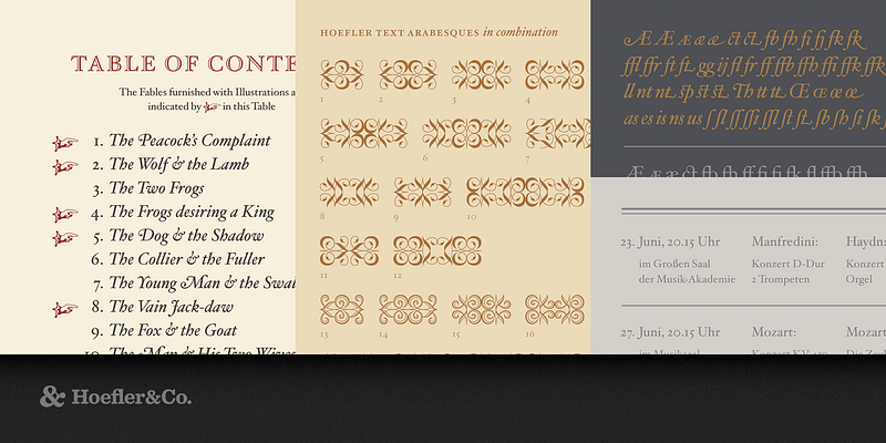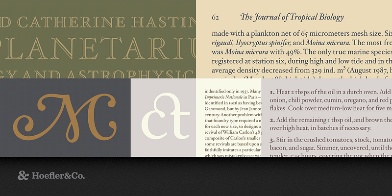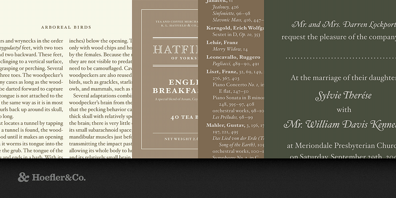 The Hoefler Text typeface was designed by Jonathan Hoefler in 1991, with contributions from Eric Siry. Created for Apple Computer, it was one of the first digital typefaces to restore many of the vanished traditions once central to fine typography such as extended ligatures, small capitals, engraved initials, and arabesque borders. Not explicitly a historical revival, Hoefler Text is instead a typographic omnibus of seventeenth century styles, paying special tribute to the work of Jean Jannon (1580-1658), whose work was long misattributed to Claude Garamond, and Miklós Kis (1650-1702), the creator of the typefaces commonly ascribed to Anton Janson.