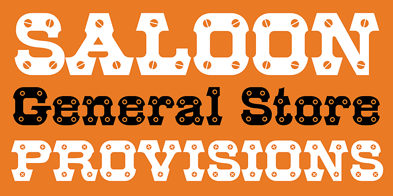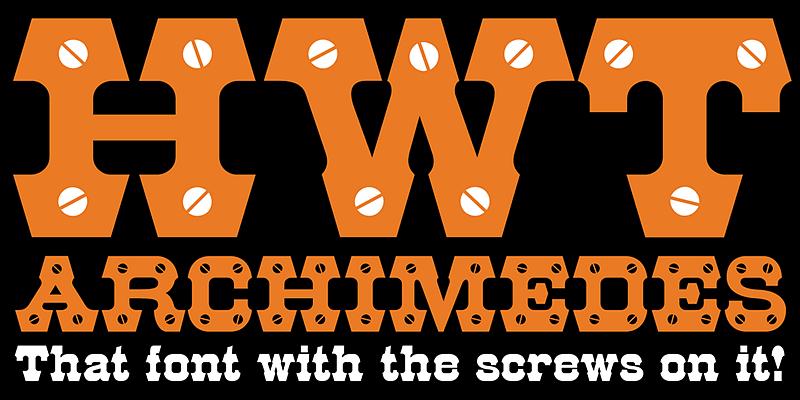 HWT Archimedes is a revival of a wood type design sometimes known as Mansard. The variation with screw heads in the design was first seen in 1879 by the Wm. H. Page Co.