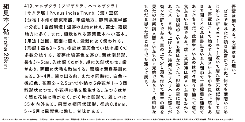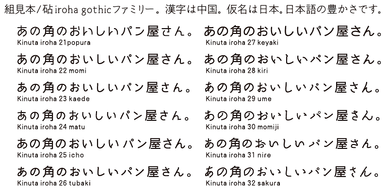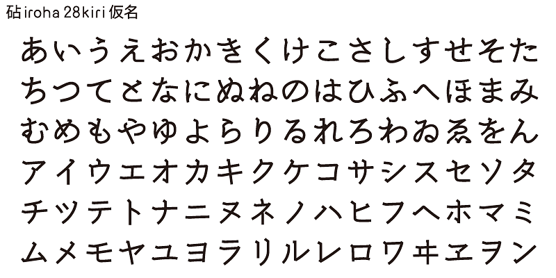 iroha 28kiri has the feeling of brush-script handwriting with kana characters that are slightly vertically compressed to give a solid, old fashioned look.
