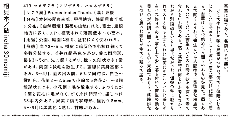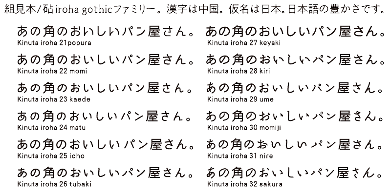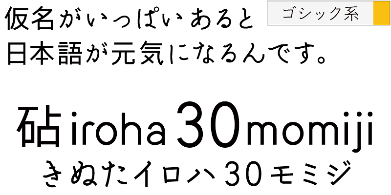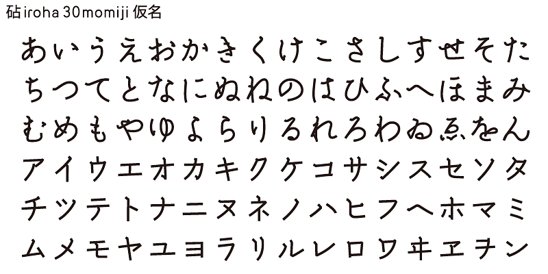 iroha 30momiji’s kana design incorporates a rhythmic brush-stroke. The curves of kana characters together with the linear strokes of the kanji create a uniquely enjoyable harmony.