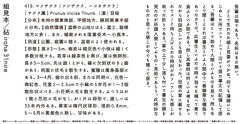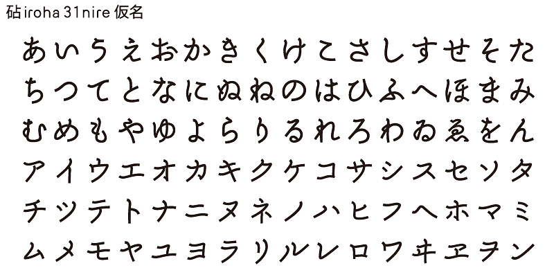 Iroha 31nire’s kana characters are based on a gothic style verison of MaruminOld. With the look of a brush-script, it has a compact and cute design.