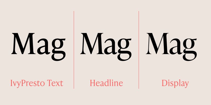 IvyPresto is an Old Style (or Garalde) Display family based on the works of Hendrik van den Keere. The large x-height, thin serifs, hairlines, and narrow proportions makes IvyPresto ideal for Display and headline use. An extensive range of weights and two optical sizes allows for plenty of flexibility for all your typesetting needs. The Ivy Foundry, 2020.