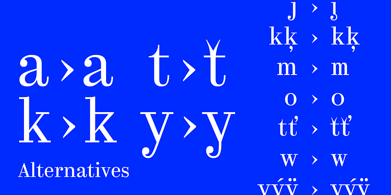It also contains two stylistic sets, one default and one alternate, called Regular and Irregular, respectively. The latter set offers characters in bizarre shapes that are difficult to imagine as a text face but that works well in large sizes.