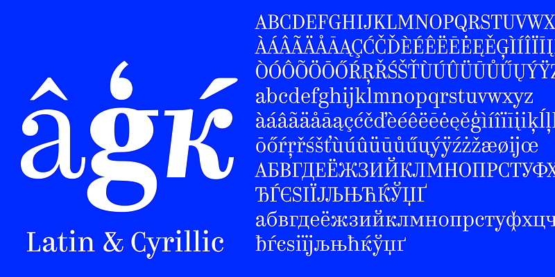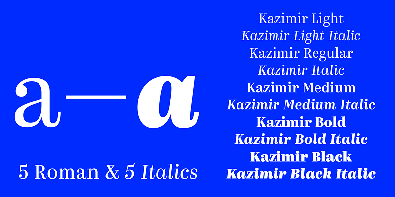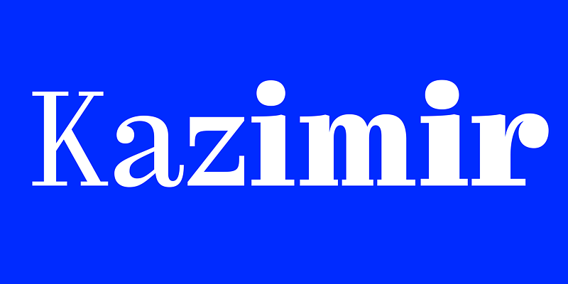 Kazimir is a Modern serif style typeface with five weights, from light to bold, with matched italics. The face has slightly narrowed proportions, long extenders and dynamic strokes reminiscent of the rhythms of transitional serifs. Kazimir is a reworking of book typography of the late 19th and early 20th centuries and specifically of the typeface used in the book, History of Russian Literature, by P. N. Polevoy, published by A. F. Marks in 1900. Kazimir blends various features of pre-revolutionary Russian typography with contemporary ideas of fashion, form and harmony.