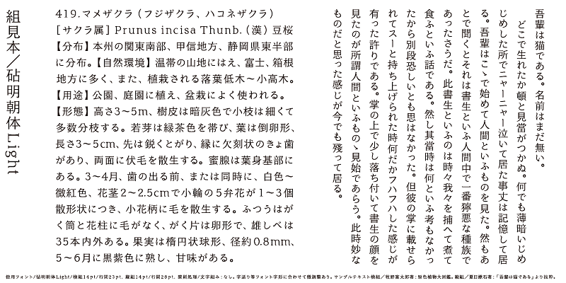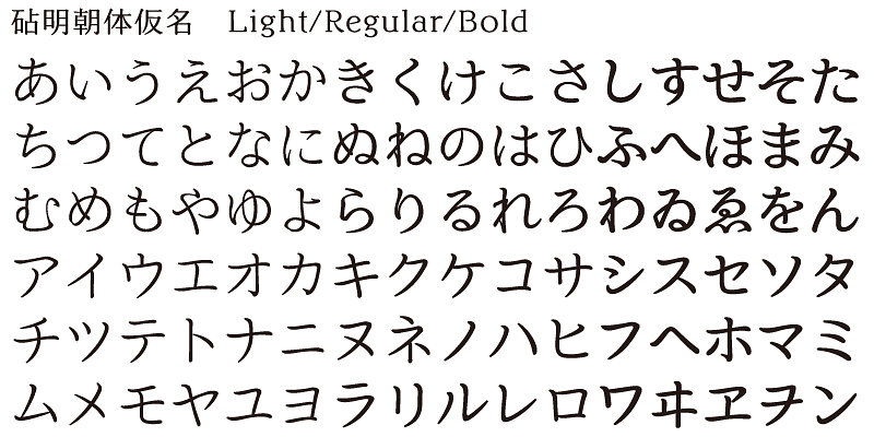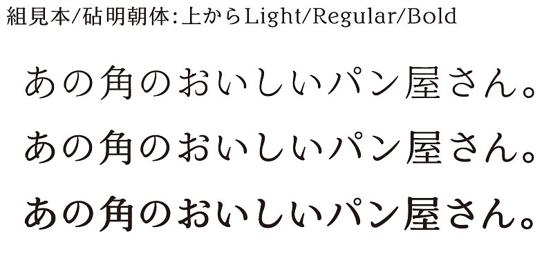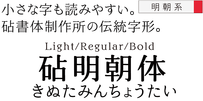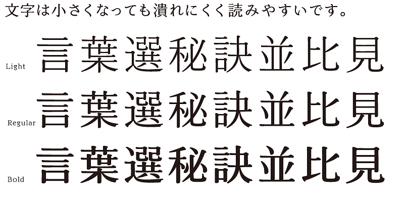 The design of Kinuta Minchotai’s kanji, kana, Latin characters and numbers is based on two design concepts: “elegance” and “ma (space)”. The kanji characters, which use no straight lines, look smooth and elegant, especially in larger type sizes. Latin characters integrate elements of the kanji characters, creating an unprecedented collaboration between the West and the East. A reader’s eyes will glide smoothly over text set in Kinuta Minchotai. Three weights are available.